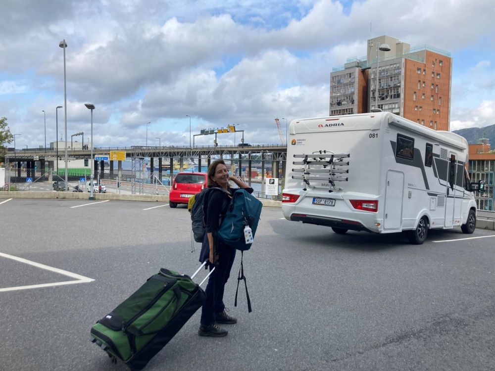 - Milena Holmgren moving luggage to Otta, our camper in Bergen